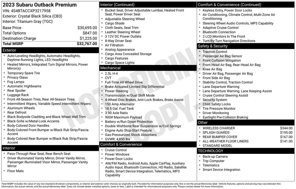 With its rugged good looks, spacious cargo area, and array of thoughtful features, this 2023 Subaru Outback Premium is the perfect blend of utility and sophistication. Whether you're tackling your daily commute or embarking on a weekend adventure, this Outback will exceed your expectations.
