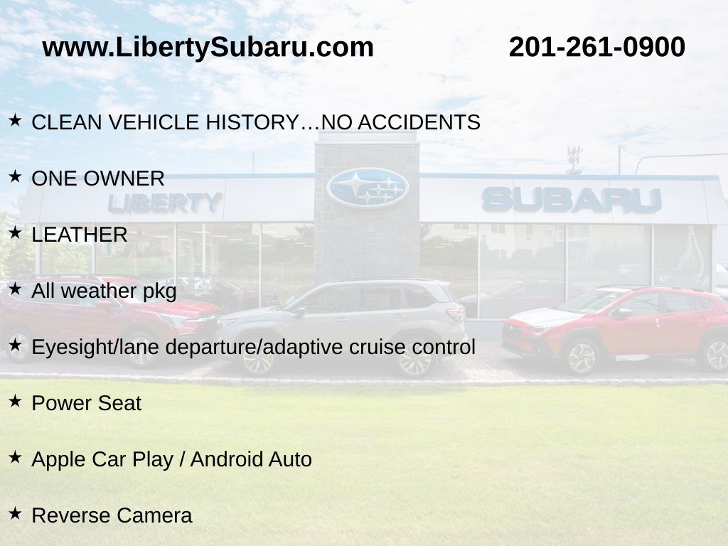 CLEAN VEHICLE HISTORY...NO ACCIDENTS, ONE OWNER, LEATHER, All weather pkg, Eyesight/lane departure/adaptive cruise control, Power Seat, Apple Car Play / Android Auto, Reverse Camera, Blind Spot Detection + Rear Cross Traffic Alert, Reverse Automatic Braking, Power Rear Gate, Panoramic Moonroof. CARFAX One-Owner.